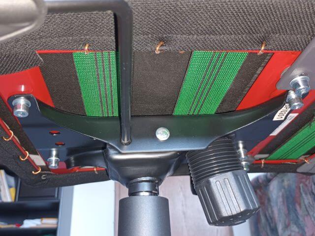 - Turn the chair upside down or lie your chair on its side and locate the bolts that hold the mechanism onto the seat pan. There are usually at least four of these, remove them and keep them somewhere safe. The whole base mechanism and seat pan section should be separate now. It is wise to remove the casters from the base at this point, as they have been known to fly off in some instances.